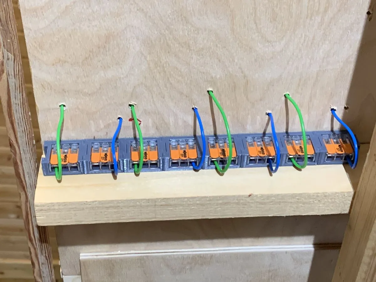 WAGO-Hebelklemmen in einer 3D-gedruckten Halterung zur sauberen und übersichtlichen Verkabelung unter der Modellbahnanlage.