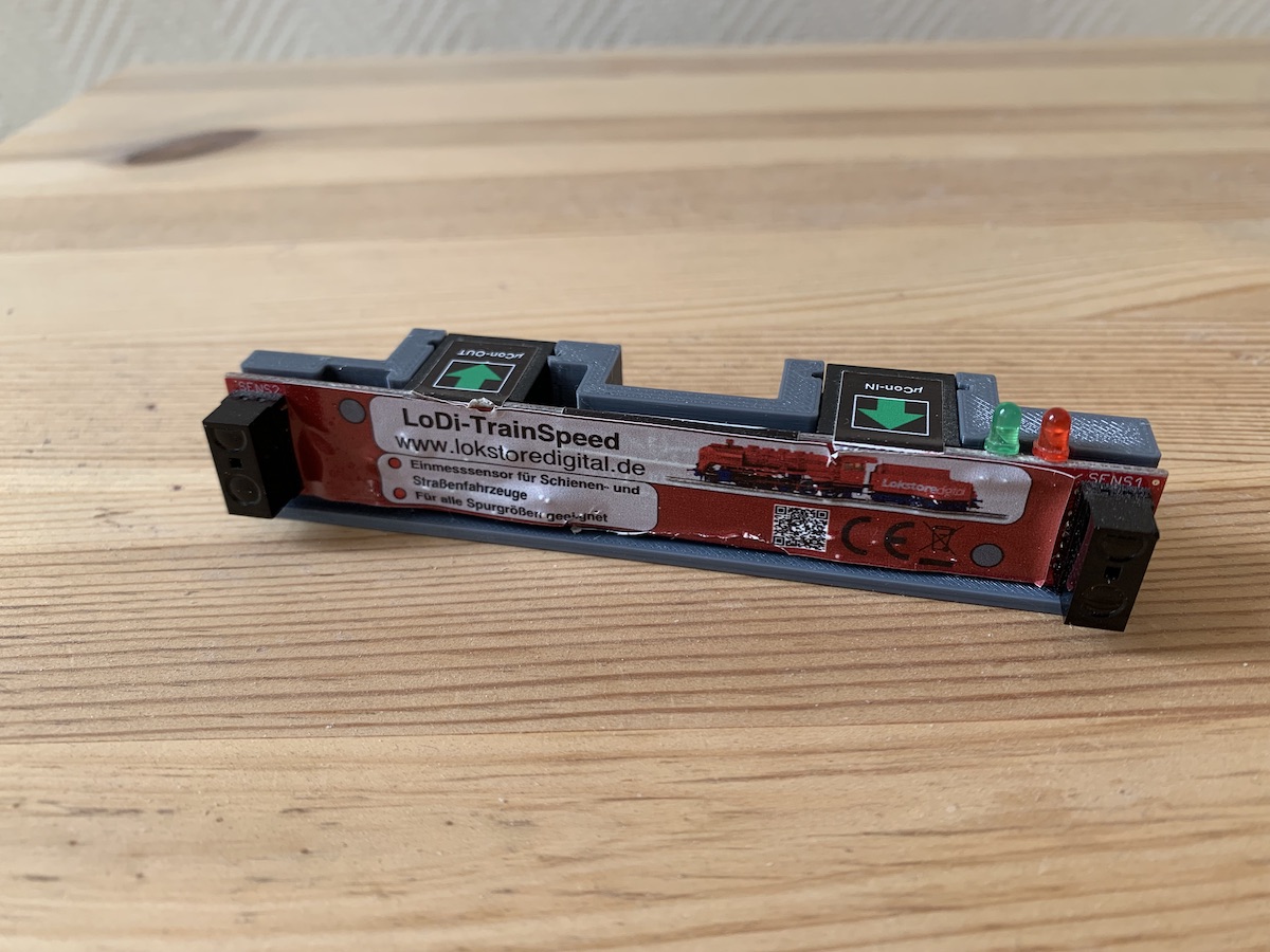 Die Höhe bis zum Sensor beträgt derzeit ca. 9mm und ist vorerst für die Spurweite TT gedacht, jedoch kann man sich selbst mit einem Holzstück, die Halterung höher setzen.
