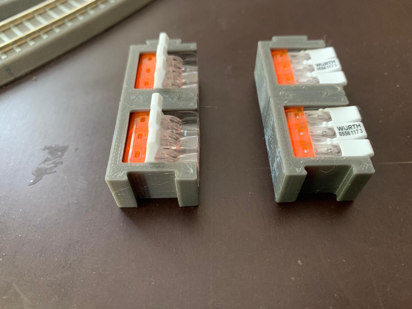 Die Halterung ist in Ausführungen für die 3er Elmo Klemme erhältlich und wird einfach mit einer Senkkopfschraube (3,0 x 12 oder 14 mm) am gewünschten Platz montiert. Die Klemmenhalterungen lassen sich miteinander verbinden und in Reihe platzieren. Dank einer integrierten Rastnase bleiben die Klemmen fest an ihrem Platz und sind bei Bedarf leicht austauschbar. Diese Lösung sorgt für mehr Ordnung und Übersichtlichkeit in der Schaltzentrale oder unter der Modelleisenbahnanlage, indem sie den Klemmen einen sicheren Platz bietet.